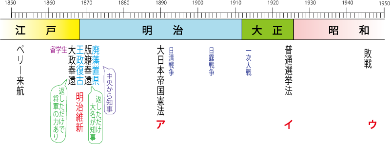 | ① 現在県知事は県民による選挙で選ばれます。 しかし,明治の初め,県知事は政府から任命されました。それでは,県知事が県民の選挙で選ばれるようになったのはいつからだったと思いますか。 予想 ア 大日本帝国憲法が制定されてから。 (1890年頃) イ 普通選挙法が施行されてから (1925年ごろ・大正時代) ウ 敗戦後 (1945年後) エ その他 ![]() |