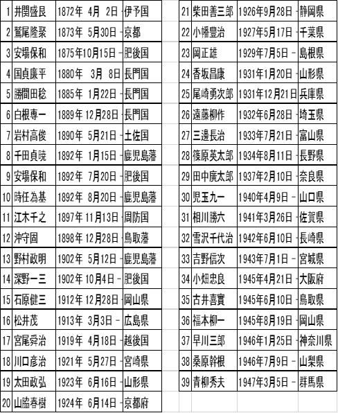 | 県知事を住民の選挙によって選ぶようになったのは,1947年からです。(結果はウ) ② 愛知県の場合,戦前の知事(つまり選挙で選ばれたのではなく任命された知事)は39人います。 この知事のうち,愛知県出身者はどのくらいいるでしょう? 予想 ア 8割以上 (30人以上) イ 半分ぐらい(20人前後) ウ 2割以下 (10人以下) |