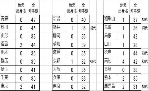 1872年から1947年の愛知県知事の出身地![]() 愛知県出身の人は0でした。 ③ では,ほかの県ではどうでしょう? ウキペディアで調べたところ,47都道府県のうち,歴代県知事の出身地が分かったのは27都府県だけです。 この27都府県ではどうでしょう? 愛知のように,地元出身の県知事の割合が1割以下のところが多いのでしょうか? それとも,愛知が特殊なのでしょうか? 予想 ア ほとんどの都府県が愛知と同じ。 (地元出身の知事はどこでもほとんどいない) イ ほとんどの都府県が愛知と同じではない。 (愛知のような県はほんの少し) ウ いろいろな都府県があって一つの傾向はない。 エ その他 |