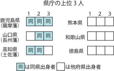 | 1872年~1947年の地元出身の知事の人数 47都道府県のうち判明した27都府県 ![]() 街角かがく倶楽部の授業では,「明治の新政府と旧藩閥」のお話を読んだ後,この一連の問題を「おまけの問題」としてやりました。 私は,授業書の「明治の新政府と旧藩閥」というお話を分かりやすくするために,文章で書いてあることを下のような図にして示していました。